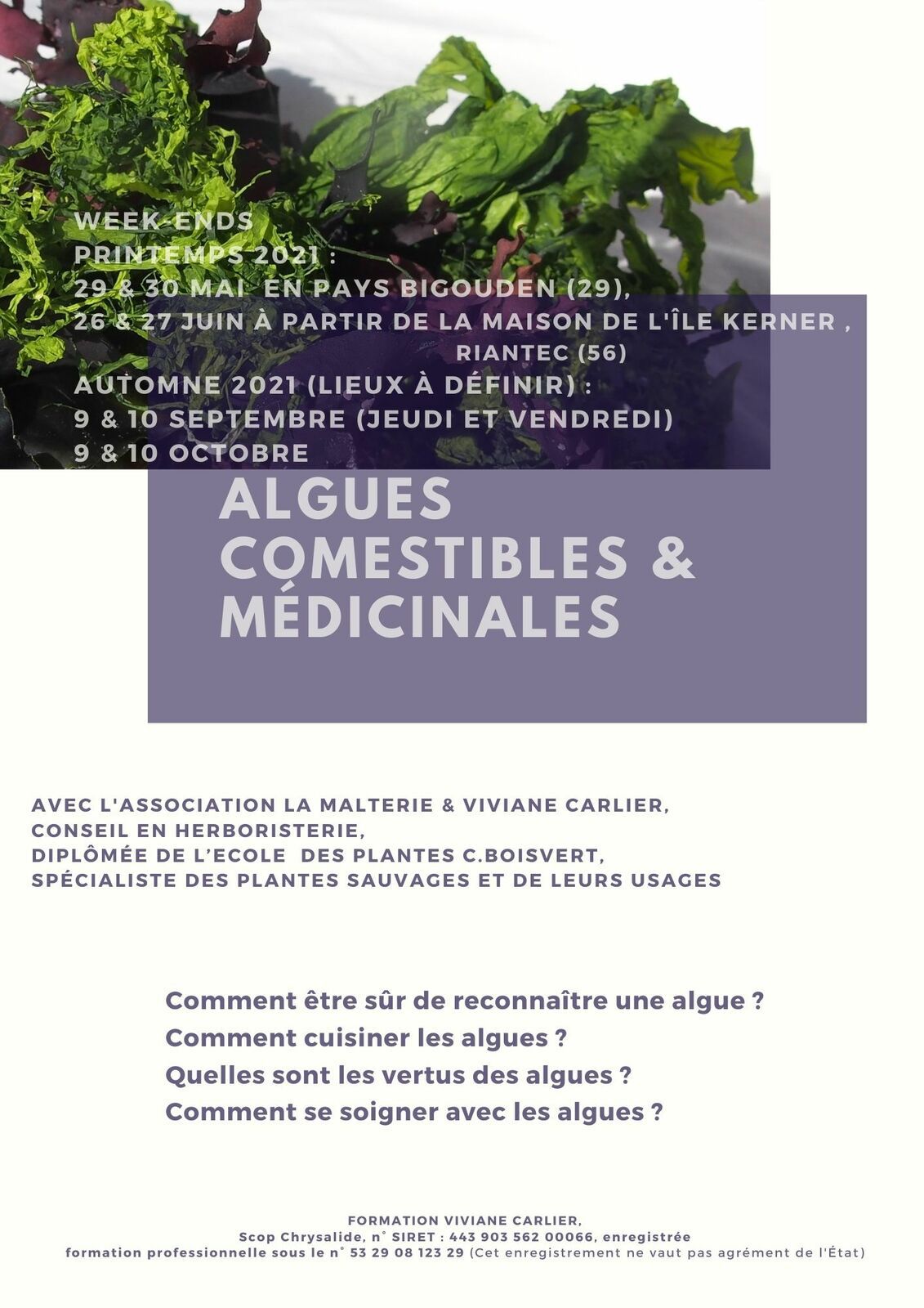 29 et 30 mai : Comment être sûr de reconnaître une algue ? Comment cuisiner les algues ? Quelles sont les vertus des algues ? Comment se soigner avec les algues ? DURÉE : 2j (14h)DATES : […]