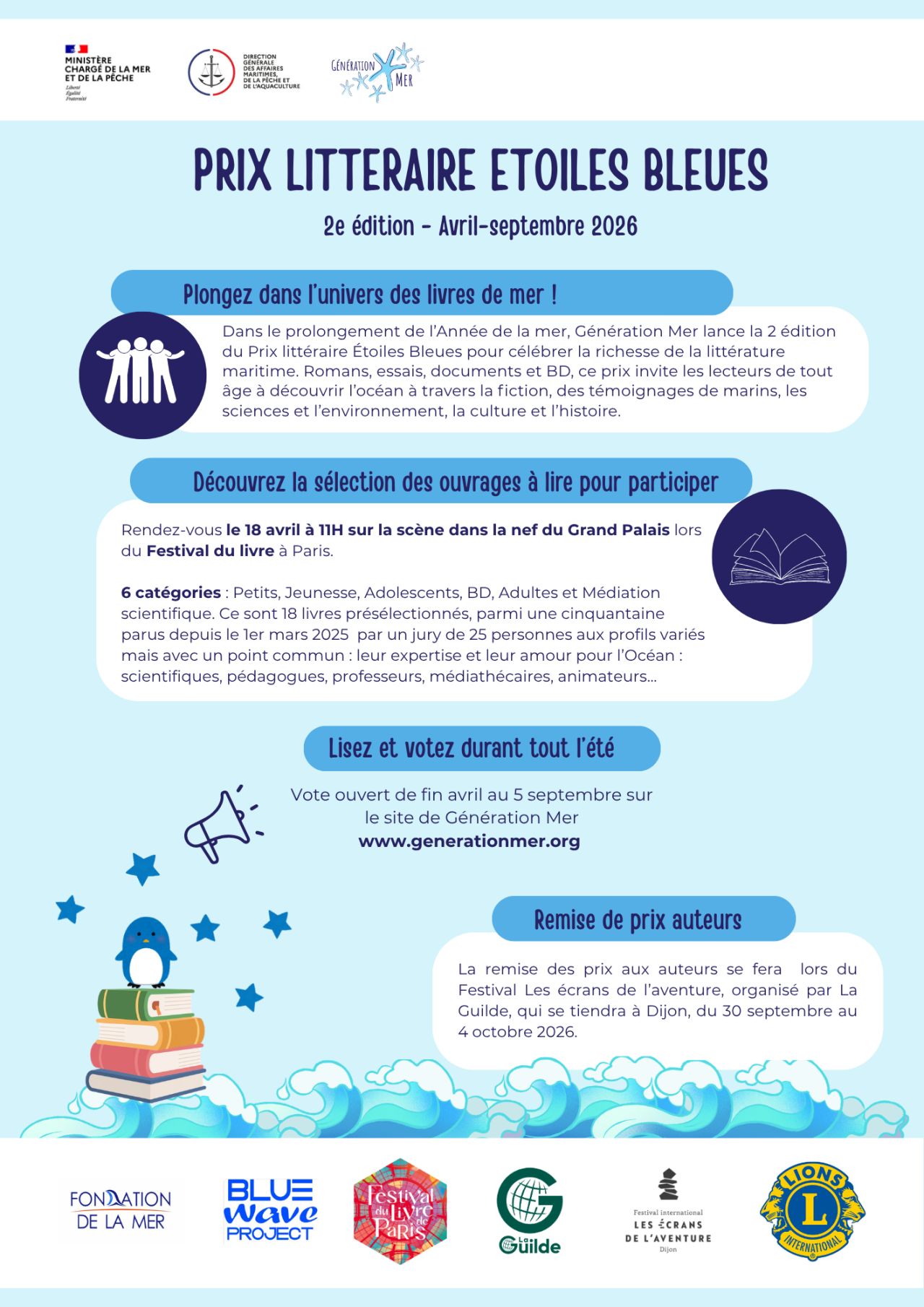 Prix littéraire Etoiles bleues, qu’est-ce que c’est ? Créé en 2025 par Génération Mer, à l’occasion de l’Année de la Mer, le prix littéraire Étoiles Bleues revient en 2026 pour […]