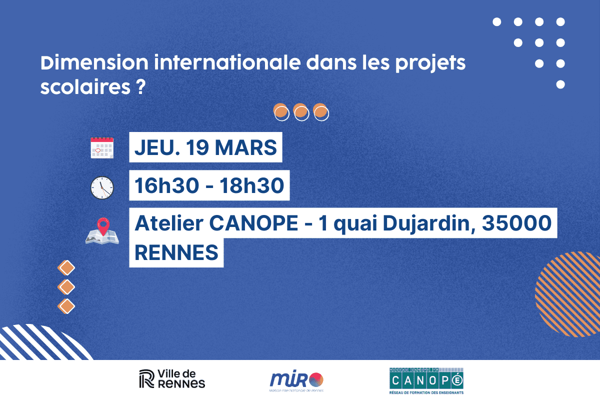 La Maison Internationale de Rennes, l’atelier CANOPE et la Ville de Rennes vous invitent pour une rencontre* en faveur d’une dimension internationale dans vos activités scolaires, dans les différentes matières ou lors d’échanges scolaires.